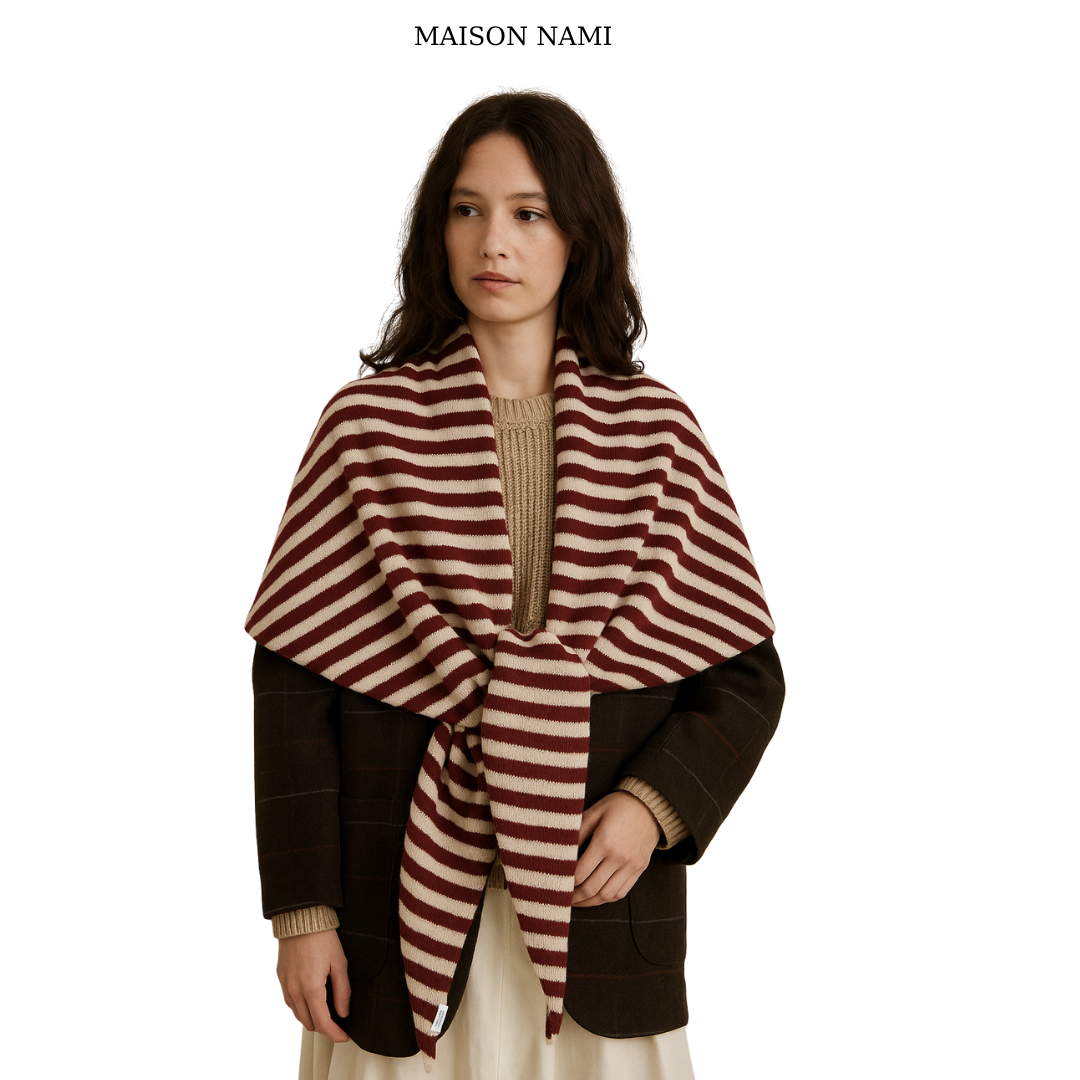 Tissée en 100 % laine naturelle, le Châle Maison Nami enveloppe le corps d’un lainage doux, respirant et durable.